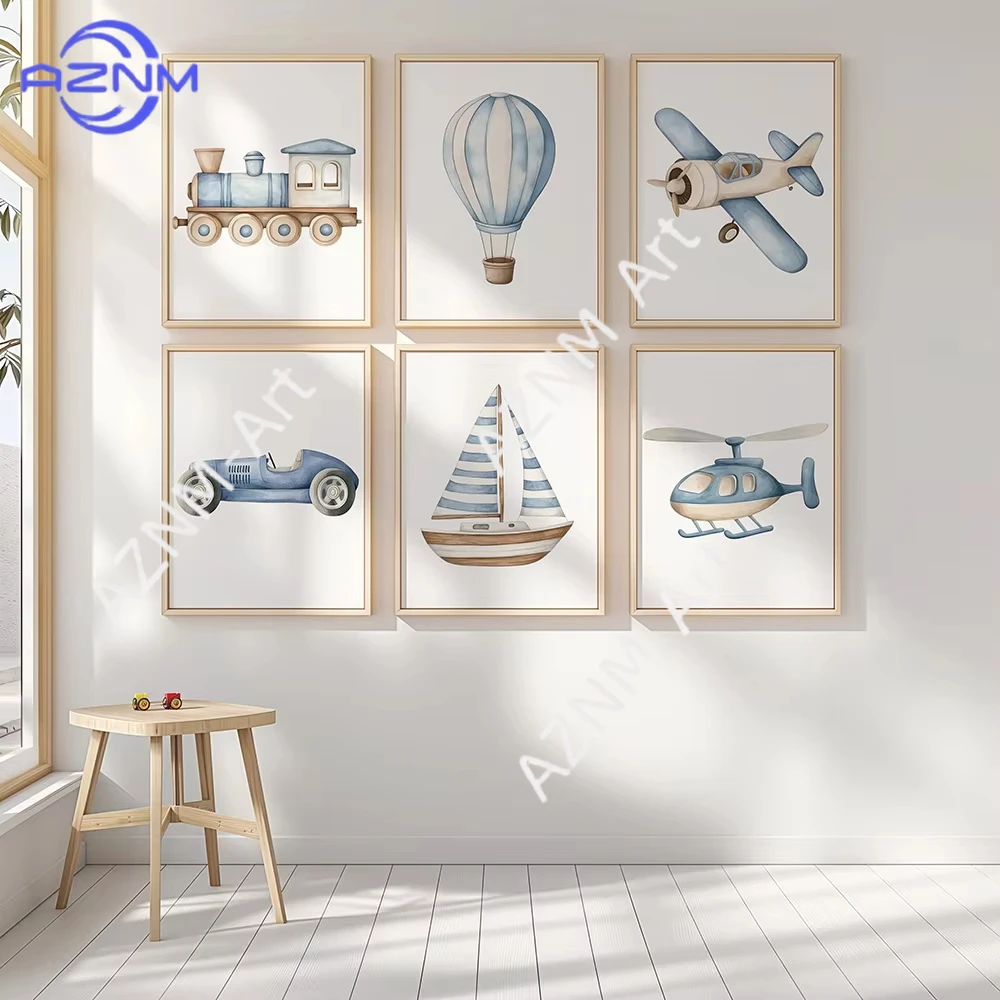 1Pc/6Pcs Vehicle Art Prints Poster Nursery Wall Art Decor Transportation Nursery Decor Plane Train Boat Hot Air Balloon Prints